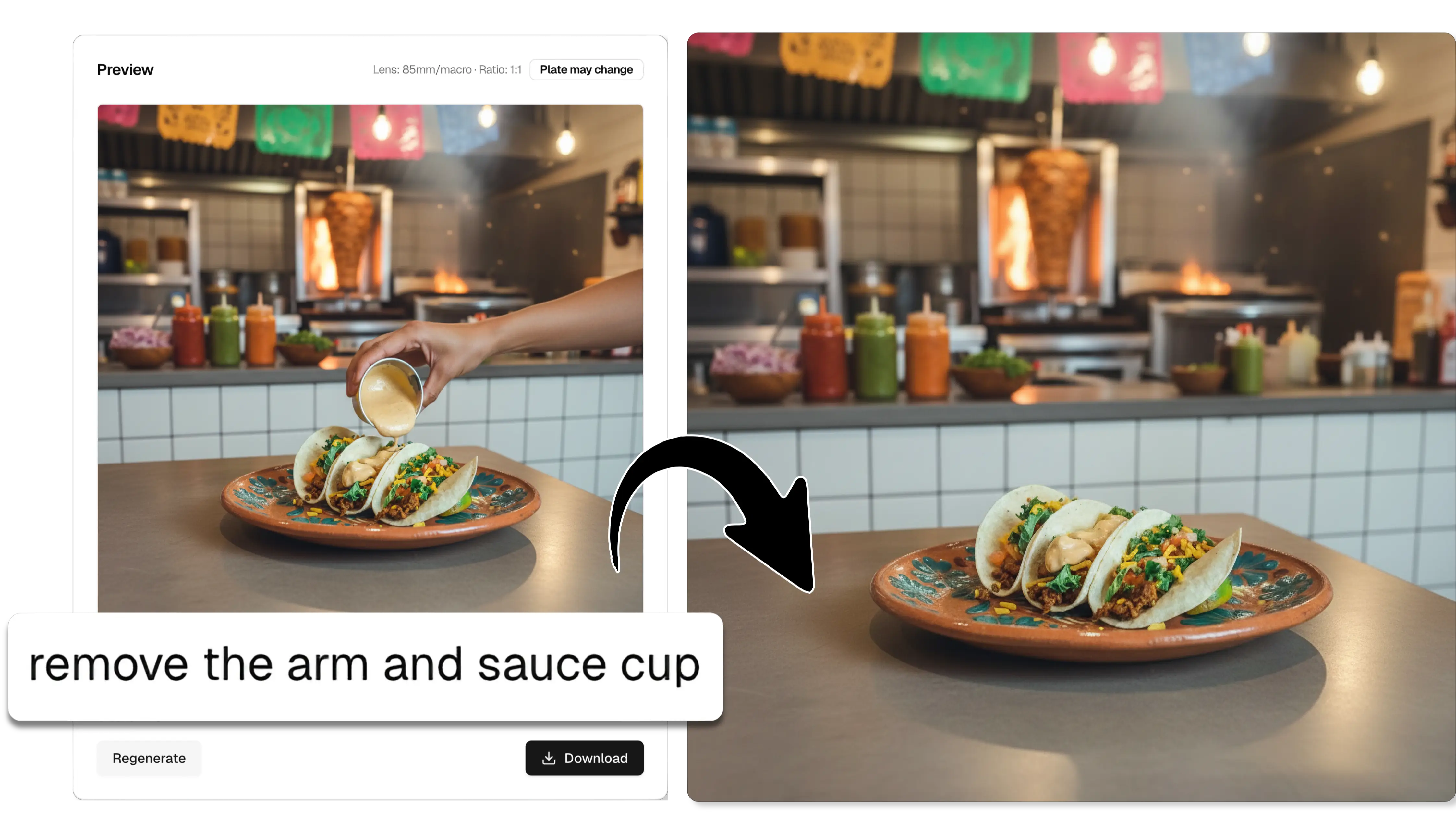 Use simple text prompts to add the final, creative touch. Add a side of fries, swap the plate, or see what a sprinkle of chili flakes looks like. It's your tool to refine a great shot until it's absolutely perfect.